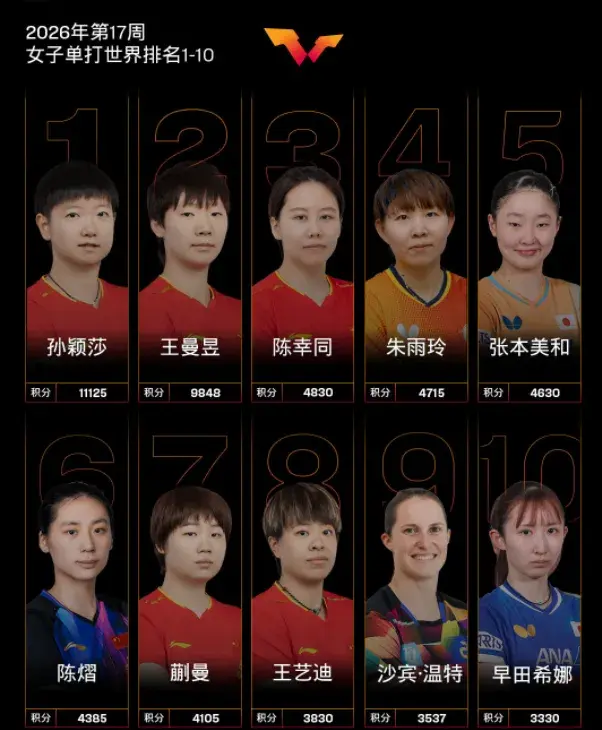 在女子单打方面,排在第一位的是孙颖莎,她的积分为11125分;排在第二位的是王曼昱,她的积分为9848分;排在第三位的是陈幸同,她的积分为4830分;排在第四位的是朱雨玲,她的积分为4715分;排在第五位的是张本美和,她的积分为4630分。第六位到第十位的依次是陈熠(4385分)、蒯曼(4105分)、王艺迪(3830分)、莎宾-温特(3537分)、早田希娜(3330分)。