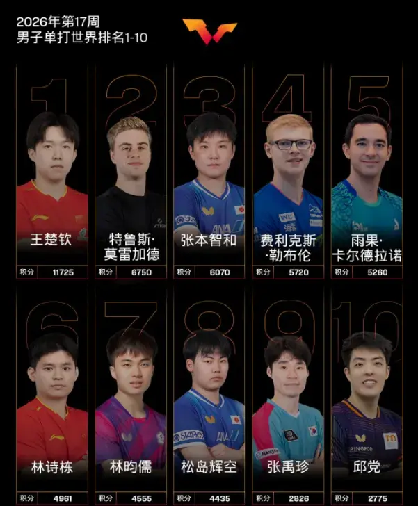 不久前,国际乒联公布了2026年第17周的世界排名,这也算是最新的世界排名了。在男子单打方面,排在第一位的是国乒选手王楚钦,他的积分为11725分;排在第二位的是特鲁斯-莫雷加德,他的积分为6750分;排在第三位的是张本智和股票小额配资,他的积分为6070分;排在第四位的是费利克斯-勒布伦,他的积分为5720分;排在第五位的是雨果-卡尔德拉诺,他的积分为5260分。
